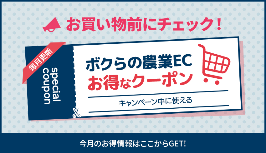 ボクらの農業EC キャンペーン中に使えるお得なクーポン一覧 2026/03/10(火) キャンペーン お得な情報を随時更新いたします。 4月9日(木)~4月13日(月)限定!お得なクーポン クーポンのご利用方法 1.まずは会員登録! 2.上にあるクーポンの画像をクリックすると対象商品の一覧がそれぞれ表示されます。 3.購入画面に進むとクーポンの欄にご利用可能なクーポンが表示され、割引金額が適用となります。 4.お得にお買い物完了! \ 気になる商品はお気に入り登録 / 商品を探す \ お買い物前のお悩み解決はこちら / 選び方ページを見る この記事にご満足いただけましたら、ぜひこちらのボタンからシェアをお願いします!