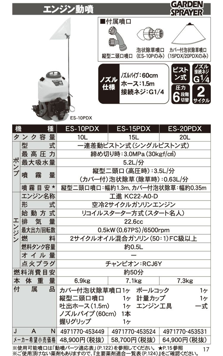 他の画像を見る エンジン 動噴 背負い式 エンジン 噴霧器 工進 動噴 ES-15PDX + ノズルセット 045183901 セット商品 背負い式 噴霧 防除 除草 価格 ¥ 53,800 税込 詳細を見る お気に入りに登録する (0)