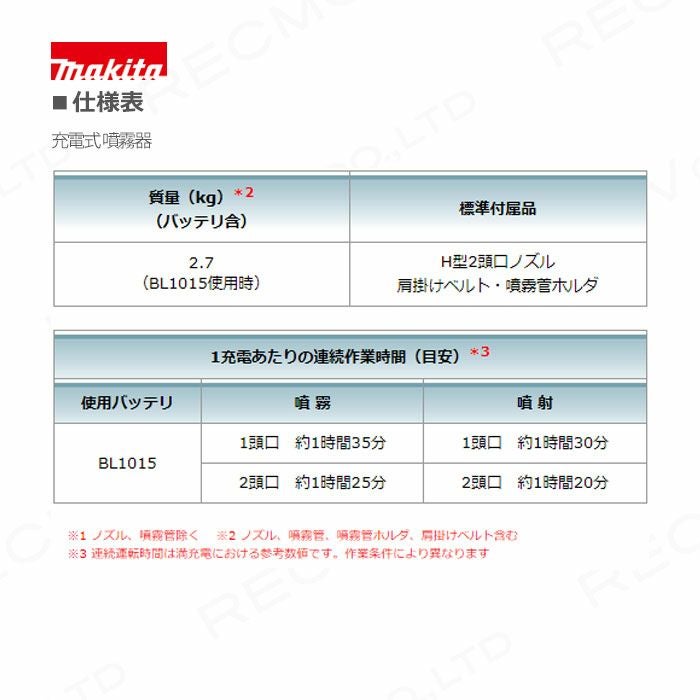 他の画像を見る 充電式噴霧器 電動噴霧器 バッテリー 肩掛け式 マキタ 電動噴霧器 充電式噴霧器 噴霧器 MUS053DWH バッテリー 肩掛け式 10.8V バッテリBL1015・充電器DC10WC付 5Lタンク 噴霧 防除 除草 バッテリー付き 価格 ¥ 24,539 税込 詳細を見る お気に入りに登録する (0)