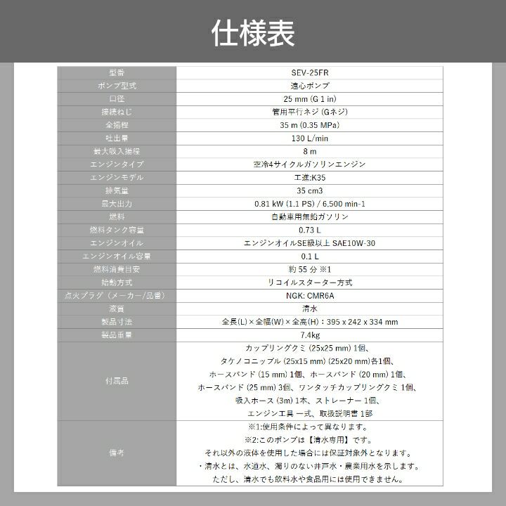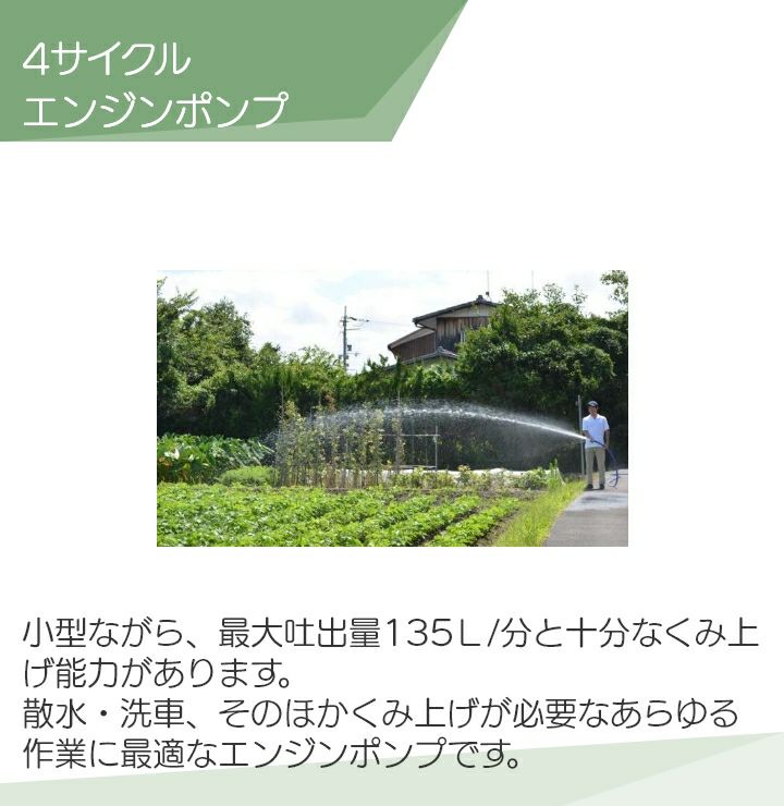 他の画像を見る 工進 清水用 田畑の散水 農機の洗浄 潅水 KOSHIN 入荷未定 工進 エンジンポンプ SEV-25FR 洗浄・散水両用ノズル付R型ホースセット 4サイクル 4ストローク ガソリン コーシン 吸入口径25mm 吐出口径25mm 吐出量130L/分 全揚程35m 価格 ¥ 33,800 税込 詳細を見る お気に入りに登録する (0)