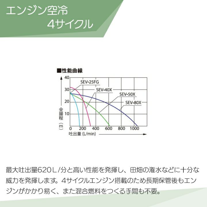 他の画像を見る 工進 清水用 田畑の散水 農機の洗浄 潅水 KOSHIN 工進 エンジンポンプ SEV-80X 4サイクル 4ストローク ガソリン コーシン 吸入口径80mm 吐出口径80mm 吐出量1050L/分 全揚程27m 価格 ¥ 46,006 税込 詳細を見る お気に入りに登録する (0)