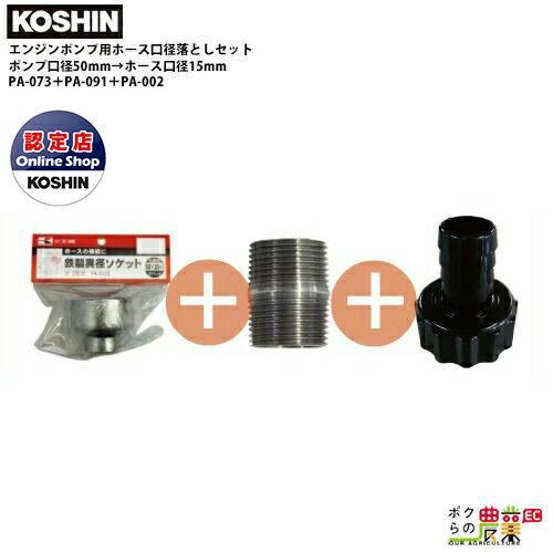 口径50mmのエンジンポンプで15mmホースを使用したい場合の取りつけ用部品をセットにしました。 型式:PA-073+PA-091+PA-002 仕様:鉄製異径ソケットPA-073(ネジ部(mm)×ホース(mm)50X25(G2"X G1"))+鉄製ニップル25mm(G1")PA-091+異形カップリングクミPA-002(ネジ部25X15(G1" X 1/2"))