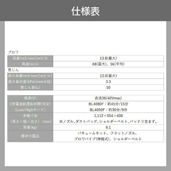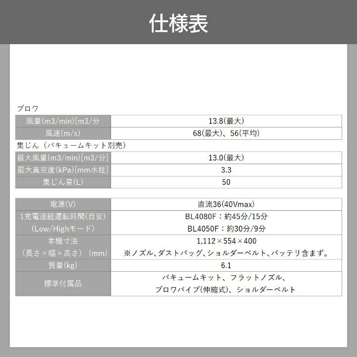 他の画像を見る マキタ 充電式 ブロワー 充電式 ブロアー 40Vmax マキタ ブロワ MUB003GZV 36V 40Vmax 充電式 肩掛け式 最大風量 13.8m3/min 6.1kg バッテリー・充電式別売 バキュームキット付 価格 ¥ 99,999 税込 在庫切れ 再入荷お知らせ お気に入りに登録する (0)