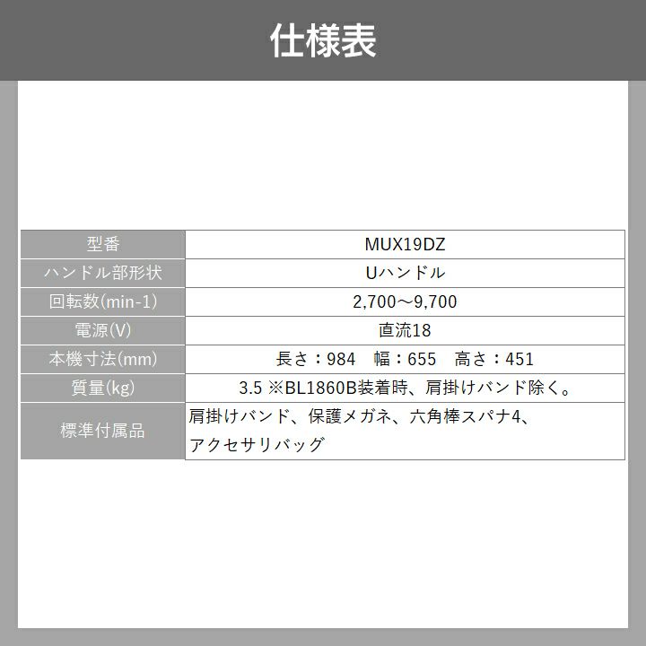 他の画像を見る マキタ 充電式 草刈機 刈払機 18V makita 電動草刈機 マキタ 充電式 草刈機 刈払機 18V MUR195WDZ 2グリップ 本体のみ バッテリ・充電器別売 チップソー付 価格 ¥ 38,432 税込 詳細を見る お気に入りに登録する (0)