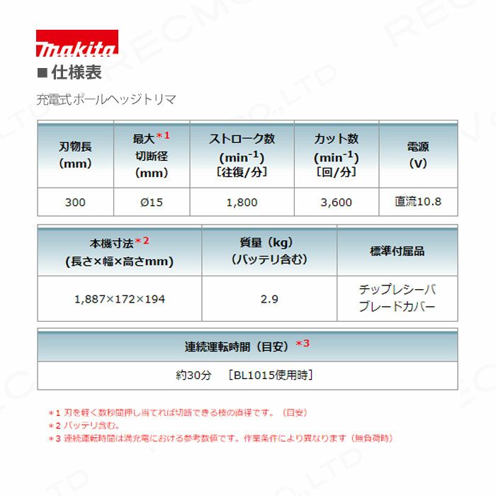 他の画像を見る ポールヘッジトリマ 充電式 バリカン サビにくい 剪定 マキタ 充電式 ポールバリカン 10.8V MUN300LDWH ループハンドル 角度可変 最大高さ約4m(作業者含む) 刃 300mm 軽量2.9kg バッテリー・充電器付属 バッテリー付き 価格 ¥ 34,650 税込 詳細を見る お気に入りに登録する (0)
