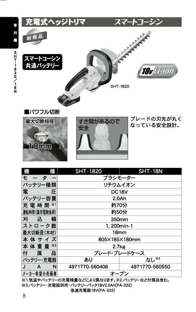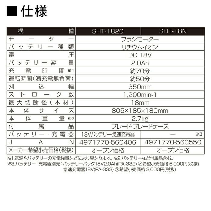 他の画像を見る ヘッジトリマ バリカン 生垣の刈り込み ヘッジトリマ 充電式 バッテリー 18V ブレード350mm 工進 SHT-1820 スマートコーシン 2.7kg バッテリー・充電器付属 バッテリー付き 価格 ¥ 16,800 税込 詳細を見る お気に入りに登録する (0)