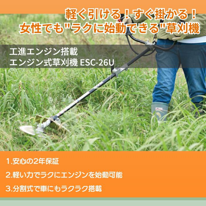 他の画像を見る 草刈機 刈払機 エンジン 工進 肩掛式 2ストローク U字 ナイロンカッター対応 分割式シャフト KOSHIN 工進 草刈機 エンジン 2サイクル ESC-26U 25.6cc Uハンドル 肩掛式 エンジン式草刈機 5.4kg 刈払機 KOSHIN 価格 ¥ 24,800 税込 在庫切れ 再入荷お知らせ お気に入りに登録する (0)