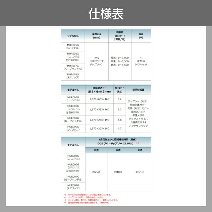 他の画像を見る 草刈機 充電式 刈払機 農地畦畔 緑地管理 河川敷 堤防 マキタ 充電式 草刈機 40Vmax MUR003GZ エンジン25ccクラス ループハンドル 刈払機 3.9kg 本体のみ バッテリ充電器別売 防水保護等級 本体IPX4 バッテリIP56 価格 ¥ 44,763 税込 詳細を見る お気に入りに登録する (0)