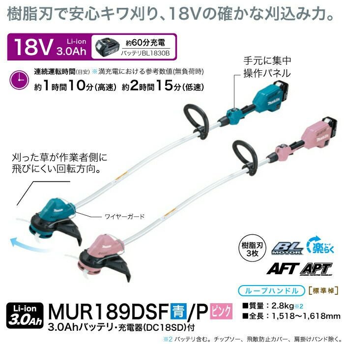 他の画像を見る 草刈機 充電式 刈払機 マキタ 充電式 草刈機 18V MUR189DSF 青 MUR189DSFP ピンク 樹脂刃 刈込み幅 230mm ループハンドル 刈払機 2.8kg バッテリー・充電器付属 バッテリー付き 価格 ¥ 39,521 税込 詳細を見る お気に入りに登録する (0)