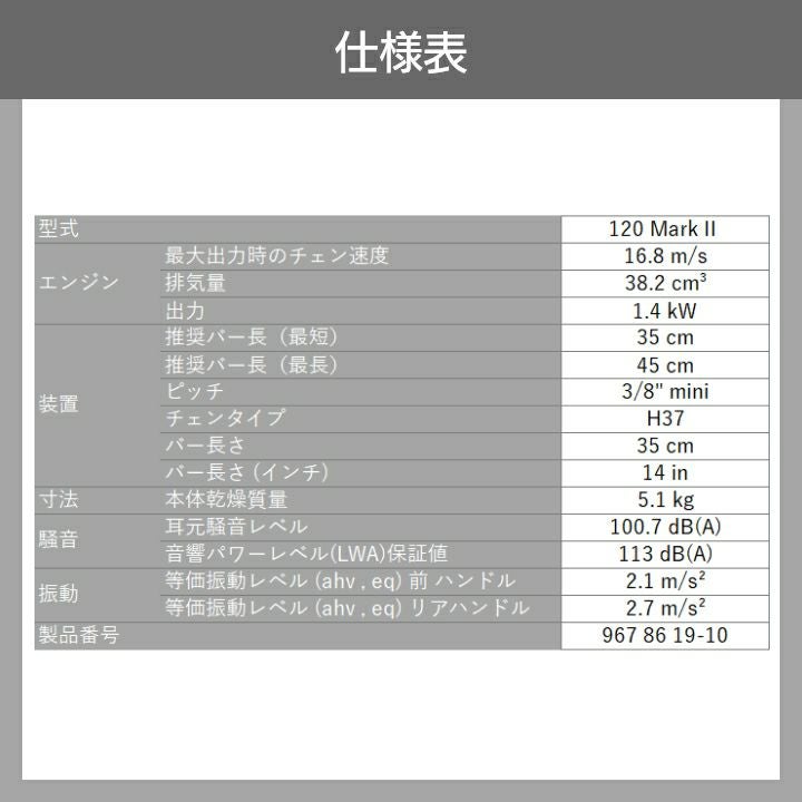 他の画像を見る ハスクバーナ チェーンソー 120e Mark II 14RT エンジン 35cm 14インチ リヤハンドル Husqvarna 2026年4月入荷予定 ハスクバーナ チェーンソー エンジン式 120e Mark II 14RT 14インチ 排気量38.2cc リアハンドル スプロケットノーズバー 5.1kg 967861910 価格 ¥ 24,226 税込 在庫切れ 詳細を見る お気に入りに登録する (0)