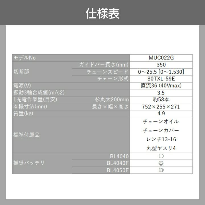 他の画像を見る マキタ チェーンソー 充電式 40Vmax 350mm マキタ 充電式 チェーンソー MUC022GRU 40Vmax バッテリー・充電器付 12/16~12/18クーポン対象 価格 ¥ 95,700 税込 カートに入れる お気に入りに登録する (0)