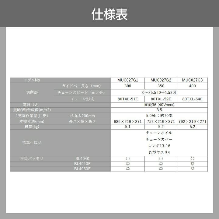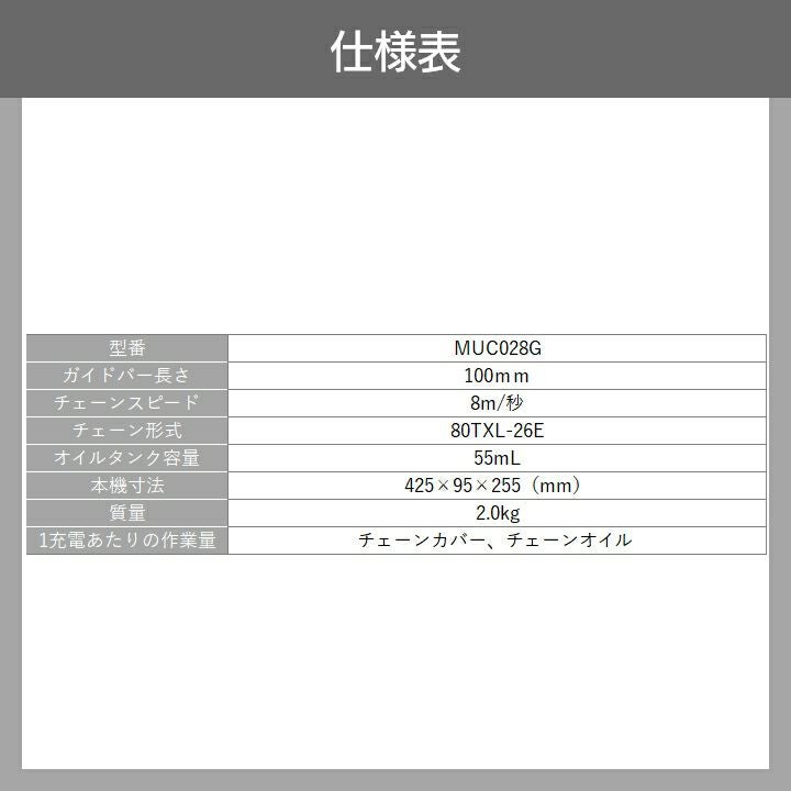 他の画像を見る マキタ チェーンソー 充電式 40Vmax 350mm マキタ 充電式 チェーンソー MUC027GZR2 40Vmax 本体のみ バッテリー・充電器別売 価格 ¥ 51,820 税込 カートに入れる お気に入りに登録する (0)