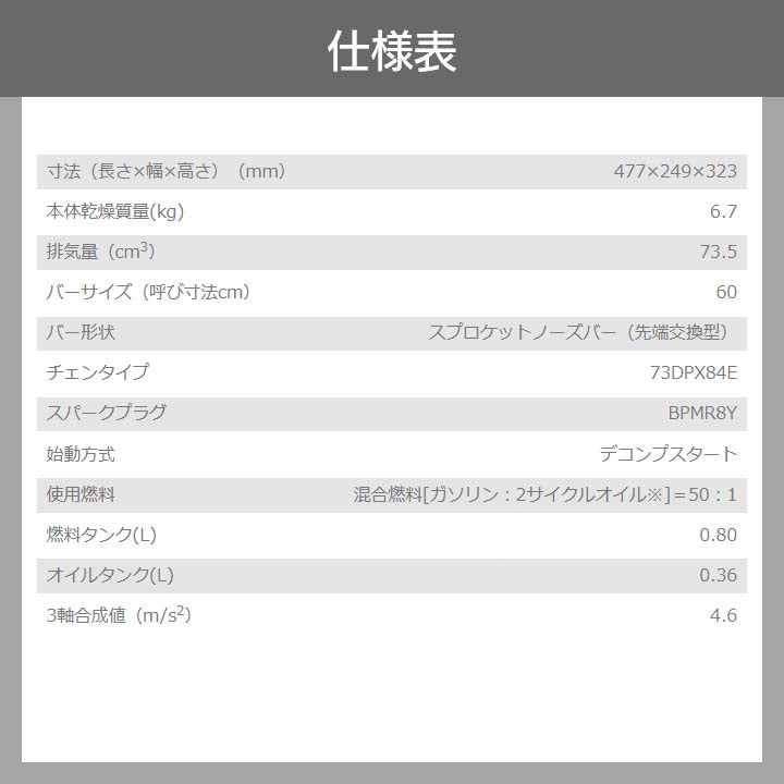 他の画像を見る 共立 チェンソー CS7330P/60R73 エンジン 24in 排気量73.5cm3 KIORITZ 共立 チェーンソー エンジン式 CS7330P/60R73 排気量73.5cc リアハンドル スプロケットノーズバー 6.7kg やまびこ 価格 ¥ 215,568 税込 在庫切れ 再入荷お知らせ お気に入りに登録する (0)