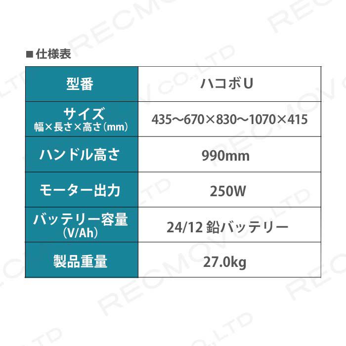 他の画像を見る 法人様限定 沖縄県と離島は配送不可 電動運搬車 アルミス ハコボU 最大積載荷量100kg 電動式 運搬車 運搬台車 ALUMIS沖縄県と離島は配送不可 価格 ¥ 172,520 税込 詳細を見る お気に入りに登録する (0)