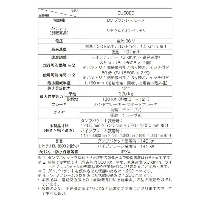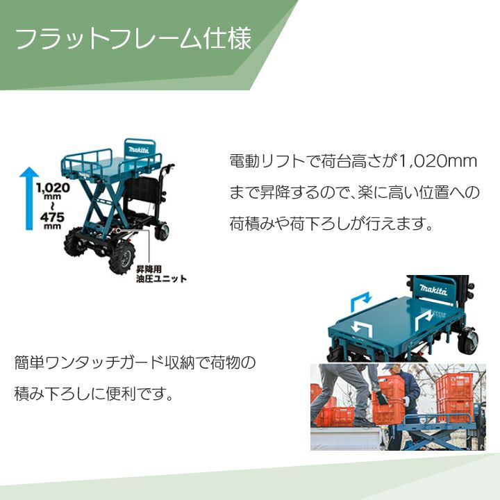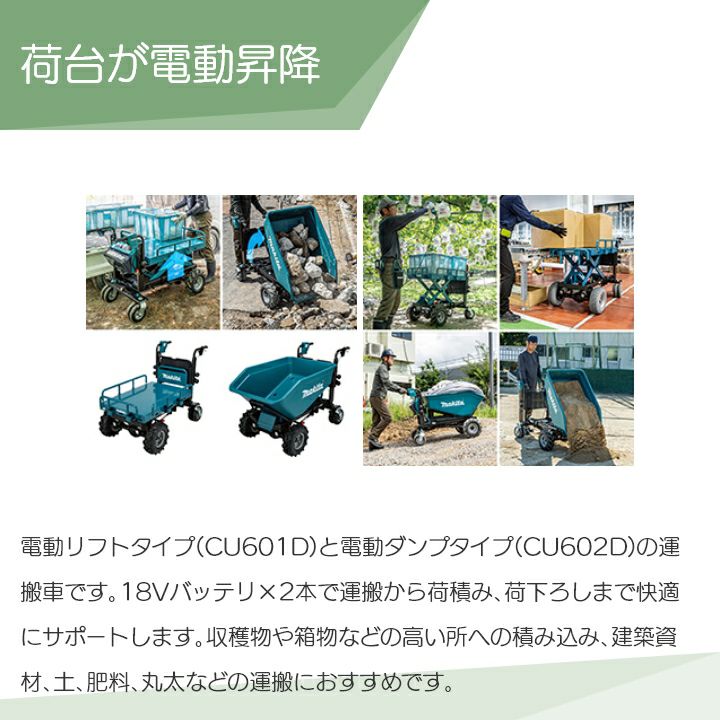 他の画像を見る マキタ 運搬車 充電式 運搬車 36V 営業所止め マキタ 運搬車 充電式 CU601DZ フラットフレーム仕様 CU602DZ ダンプバケット仕様 18V×2=36V バッテリー・充電器別売 価格 ¥ 886,590 税込 詳細を見る お気に入りに登録する (0)