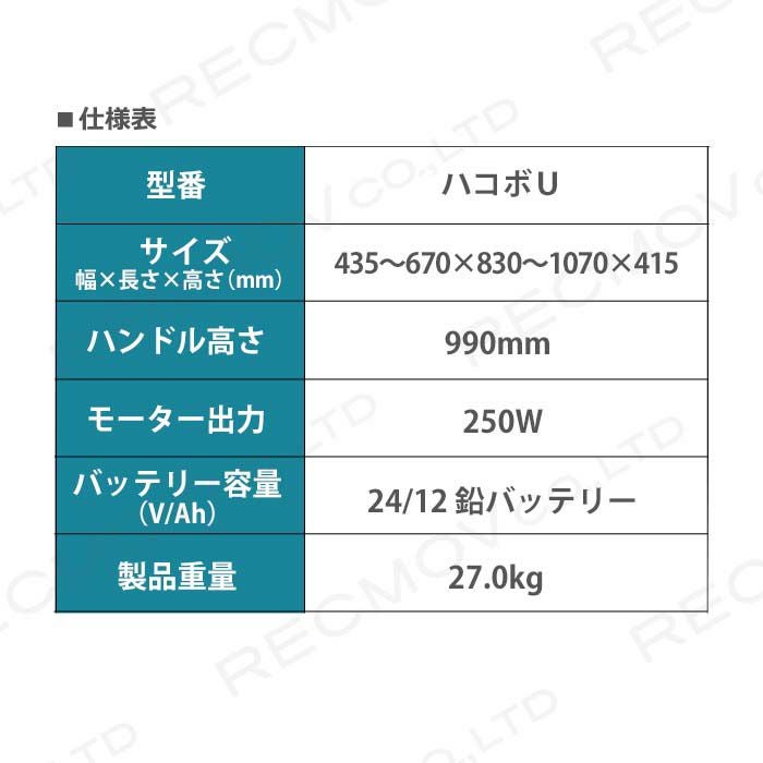 他の画像を見る 法人様限定 沖縄県と離島は配送不可 電動運搬車 アルミス ハコボU 最大積載荷量100kg 電動式 運搬車 運搬台車 ALUMIS沖縄県と離島は配送不可 価格 ¥ 172,520 税込 詳細を見る お気に入りに登録する (0)