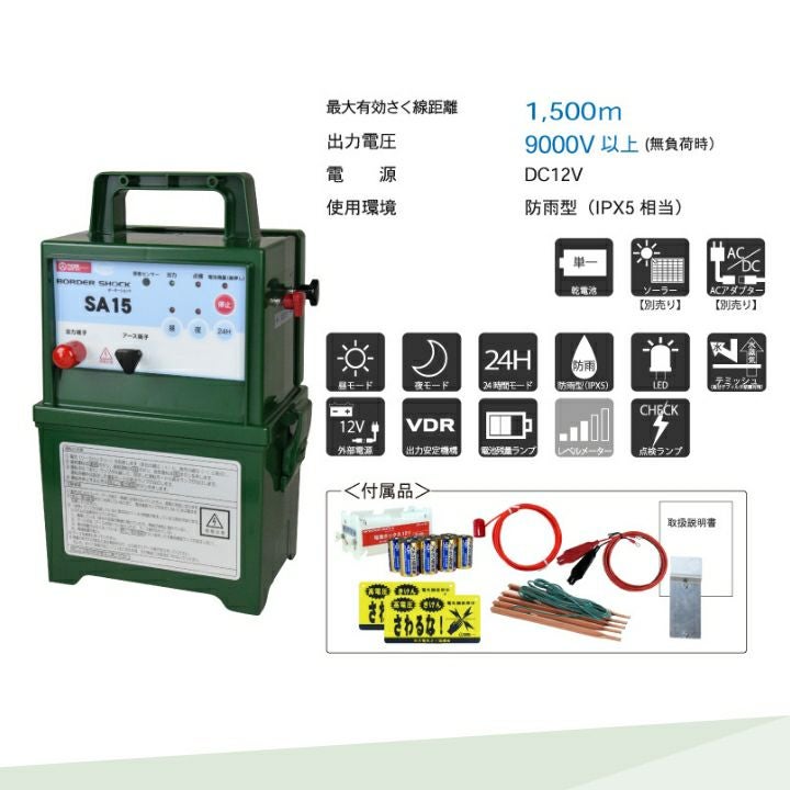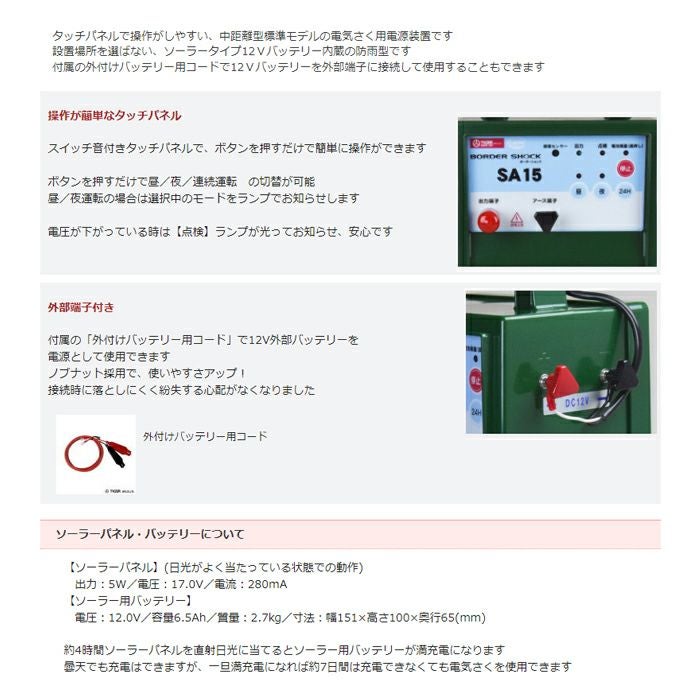 他の画像を見る 電気柵 タイガー 電気さく 電池タイプ 獣害対策 電気柵 タイガー SA15DC 本体 電池 DC12V 9000V 1500m 防雨 獣害対策商品 防獣商品 価格 ¥ 43,711 税込 詳細を見る お気に入りに登録する (0)