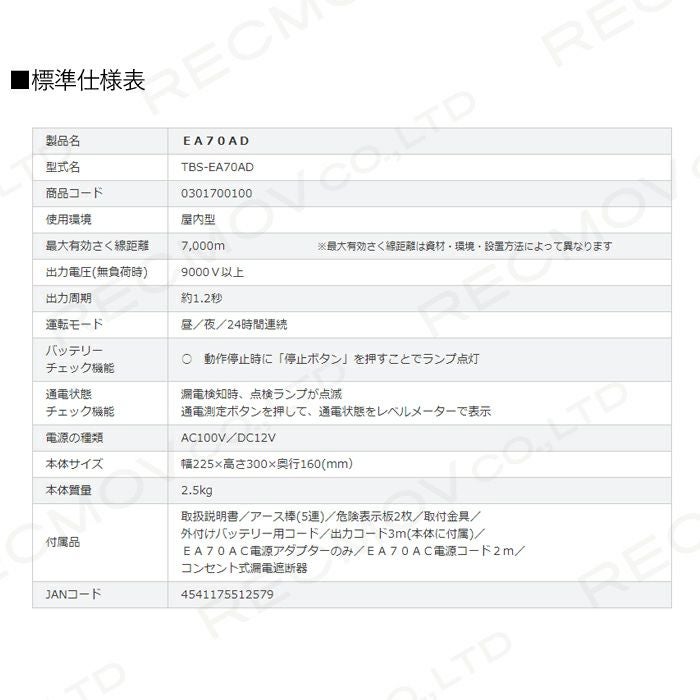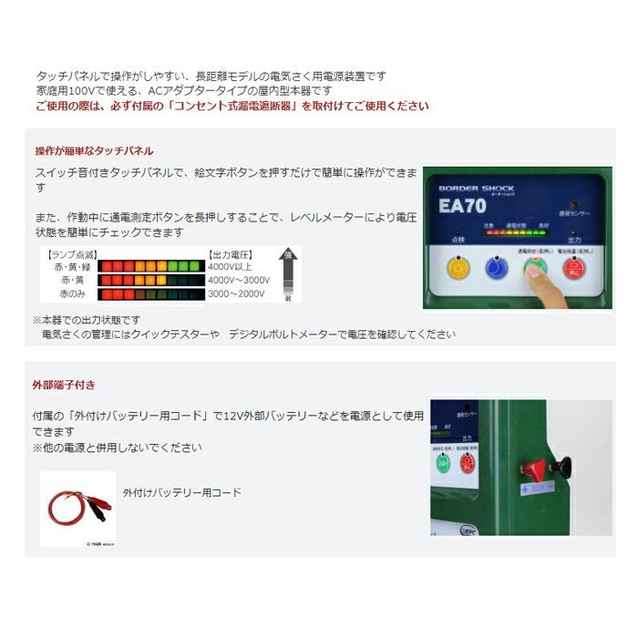 他の画像を見る 電気柵 タイガー 電気さく コンセント式 獣害対策 電気柵 タイガー EA70AD 本体 AC100V DC12V 9000V 7000m 屋内 獣害対策商品 防獣商品 価格 ¥ 65,866 税込 詳細を見る お気に入りに登録する (0)