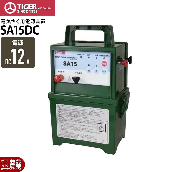 電気柵 タイガー SA15DC 本体 ボーダーショック BORDER SHOCK 防雨型 IPX5相当 有効距離1500m 出力電圧9000V 電池タイプ 電源 DC12V 昼運転 夜運転 24時間連続運転 獣害対策商品 防獣商品 獣害 被害 獣害対策 畑 駆除 電気柵 柵 電流 タイガー 猪 熊 いのしし くま イノシシ クマ 小動物 あらいぐま ハクビシン たぬき アライグマ 狸 タヌキ 猿 サル さる 電気さく セット 組み合わせ 支柱 さく線 柵線 ガイシ がいし