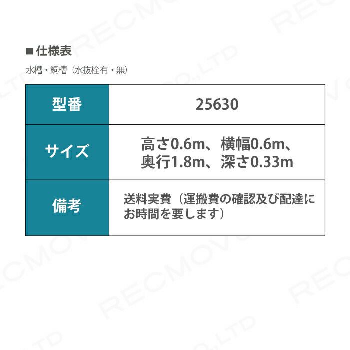 他の画像を見る 送料別途お見積り 酪農 業務用 畜産用 スリム水槽 CS200S 25661 水槽 長さ2,000×300 深さ180mm 畜産 酪農 牧畜 産業動物 牛 豚 養豚 家畜 畜産用品 価格 ¥ 89,799 税込 詳細を見る お気に入りに登録する (0)