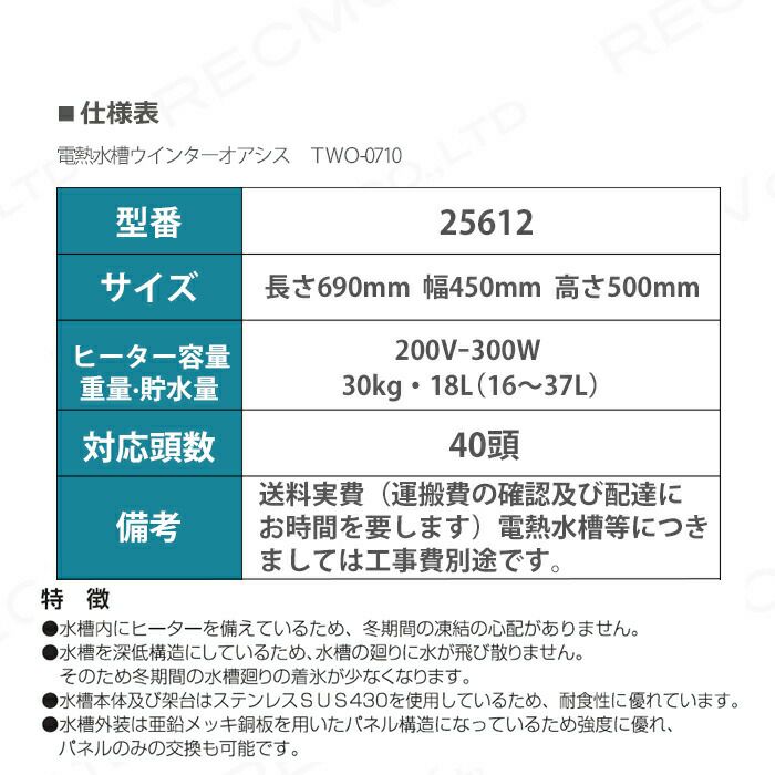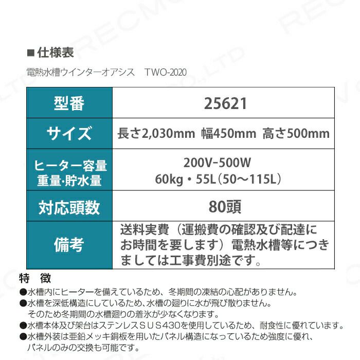 他の画像を見る 送料別途お見積り 酪農 業務用 畜産用 電熱水槽ウインターオアシス TWO-2020 25621 ヒーター ステンレスSUS430 耐食性 畜産 酪農 牧畜 産業動物 家畜 畜産用品 価格 ¥ 319,090 税込 詳細を見る お気に入りに登録する (0)