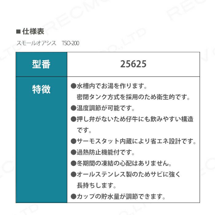 他の画像を見る 送料別途お見積り 酪農 業務用 畜産用 スモールオアシス TSO-200 25625 200V 温度調節可能 サーモスタット内蔵 畜産 酪農 牧畜 産業動物 家畜 畜産用品 価格 ¥ 175,020 税込 詳細を見る お気に入りに登録する (0)