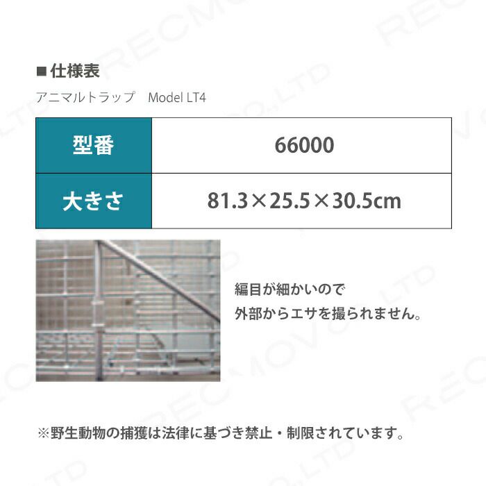 他の画像を見る 酪農用品 業務用 農業 農作業 畜産用 アニマルトラップ Model LT4 66000 小型野生動物 捕獲トラップ 罠 畜産 酪農 牧畜 産業動物 牛 豚 養豚 家畜 畜産用品 価格 ¥ 35,948 税込 詳細を見る お気に入りに登録する (0)