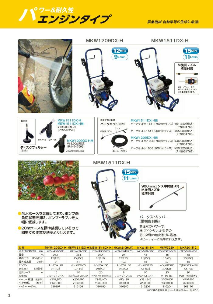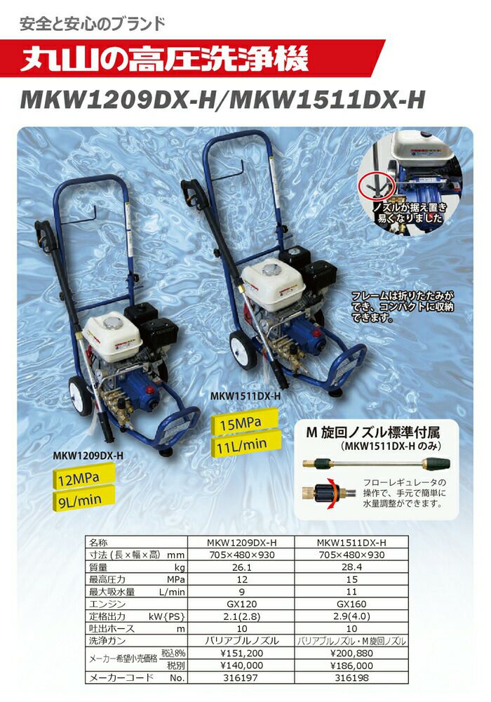 他の画像を見る 丸山製作所 エンジン式 高圧洗浄機 高圧洗浄機 丸山製作所 エンジン式 MKW1515H-1 316233 4サイクル 冷水 自吸式 価格 ¥ 281,738 税込 詳細を見る お気に入りに登録する (0)
