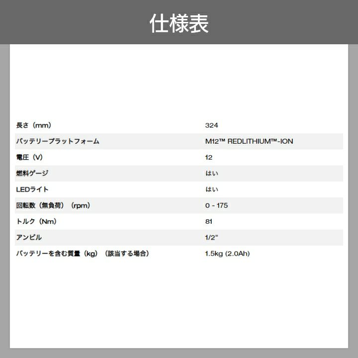 他の画像を見る ミルウォーキー M12 FUEL ミルウォーキー アングルインパクトレンチ 1/2インチ 300Nm 12V M12 FRAIWF12-0 JP バッテリー 充電器別売 価格 ¥ 29,827 税込 詳細を見る お気に入りに登録する (0)