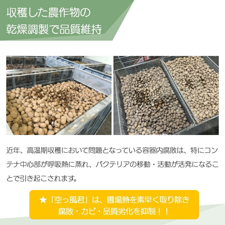 他の画像を見る 農業用乾燥機 コンテナ乾燥機 農作物乾燥機 温度管理 風乾 冷却 空っ風君(からっかぜくん) 農業用乾燥機 農作物乾燥機 鉄コンテナのまま速乾 腐敗防止 カビ抑制 価格 ¥ 1,446,500 税込 カートに入れる お気に入りに登録する (0)
