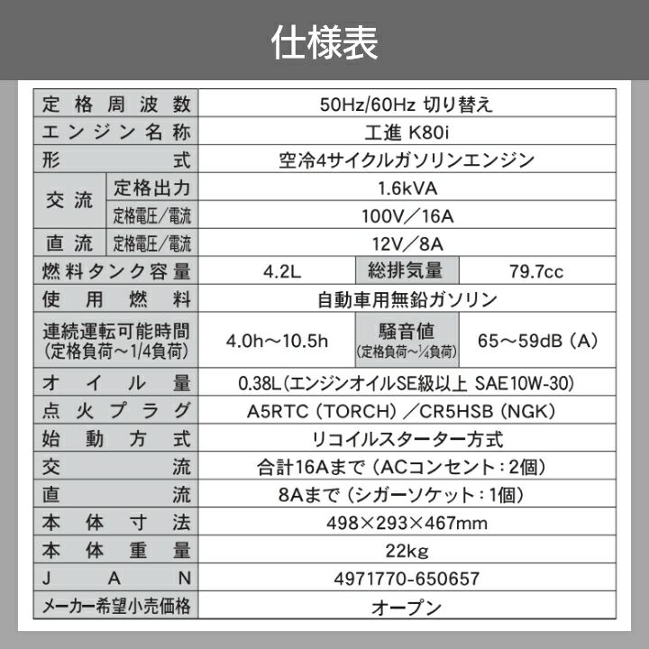 工進 発電機 インバーター KOSHIN コーシン 災害 防災 キャンプ 取扱終了 工進 インバーター発電機 GV-16i + 鉛蓄電池充電ケーブル PA-373 セット商品 1600W 1.6kVA インバータ発電機 ガソリンエンジン