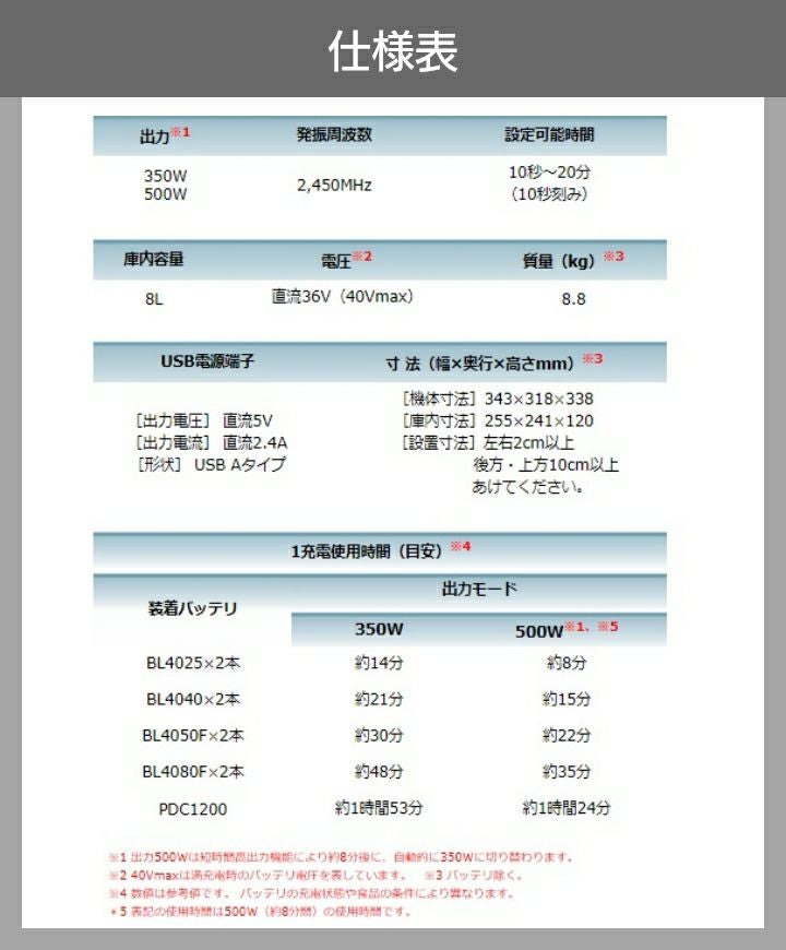 他の画像を見る マキタ 充電式 電子レンジ 充電器・バッテリ別売 防災 マキタ 充電式電子レンジ MW001GZ バッテリ・充電器別売り電子レンジ 40Vmax makita 価格 ¥ 88,790 税込 詳細を見る お気に入りに登録する (0)