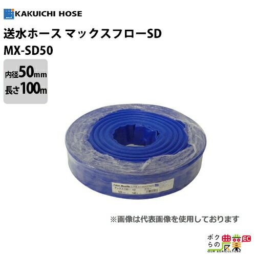 カクイチ 送水ホース サニーホース マックスフローSD 内径50mm×100M巻 MX-SD50 ブルー 送水ホース、Maxflo(マックスフロー)の汎用タイプ。 継ぎ手を使わずに長距離の送・排水が可能です。 柔軟で屈曲性に富んでいるため、折りたたみができ、格納のスペースをとりません。 一般の送・排水。 高低差の少ないところでの送・排水作業。 土木・建設工事現場での排水・給水・汚水処理等 農業用(給水・排水・灌漑用) 鉱工業(排水・給水等)