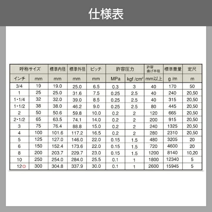他の画像を見る 内径300mm×外径318mm×10m巻 受注生産 納期別途ご案内 ホース 10m カクイチ 内径300mm インダスKST サクションホース 内面平滑 工業・産業 柔軟性 粉体 粒体 軽量 価格 ¥ 97,874 税込 詳細を見る お気に入りに登録する (0)