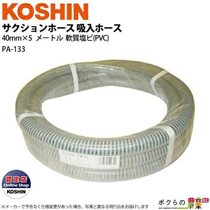 メーカー:工進 品名:吸入ホース 型番:PA-133 質量:2500g 内径:40mm 長さ:5m 材質:軟室塩ビ(PVC) 適合機種:エンジンポンプ 例)PX-640 SEV-40X等