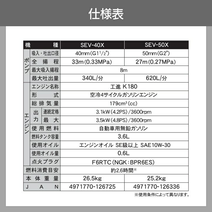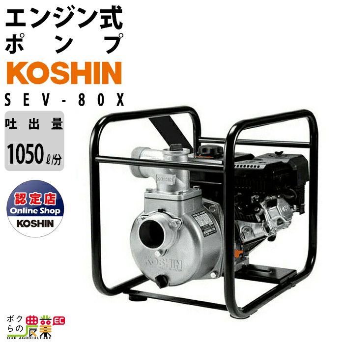 他の画像を見る 工進 清水用 田畑の散水 農機の洗浄 潅水 KOSHIN 工進 エンジンポンプ SEV-80X 4サイクル 4ストローク ガソリン コーシン 吸入口径80mm 吐出口径80mm 吐出量1050L/分 全揚程27m 価格 ¥ 46,006 税込 詳細を見る お気に入りに登録する (0)