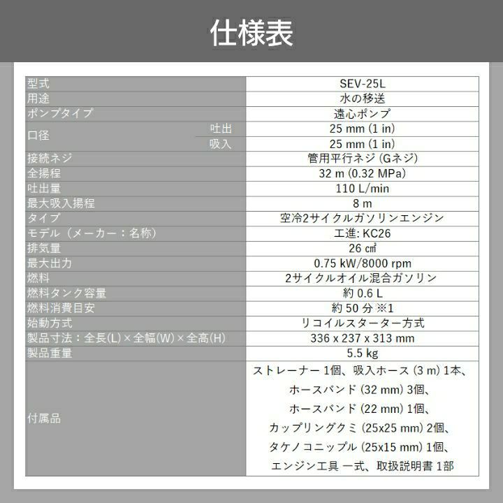 他の画像を見る 工進 清水用 田畑の散水 農機の洗浄 潅水 KOSHIN 工進エンジンポンプ SEV-25L 2サイクル 2ストローク ガソリン コーシン 吸入口径25mm 吐出口径25mm 吐出量110L/分 全揚程32m 価格 ¥ 19,800 税込 詳細を見る お気に入りに登録する (0)