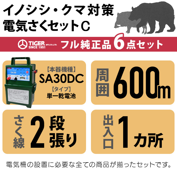 電気さくセットC イノシシ・クマ対策 周囲600m さく線2段張仕様 出入口1カ所 セット内容詳細 商品の詳しい情報は「詳細はこちら」をご覧ください。