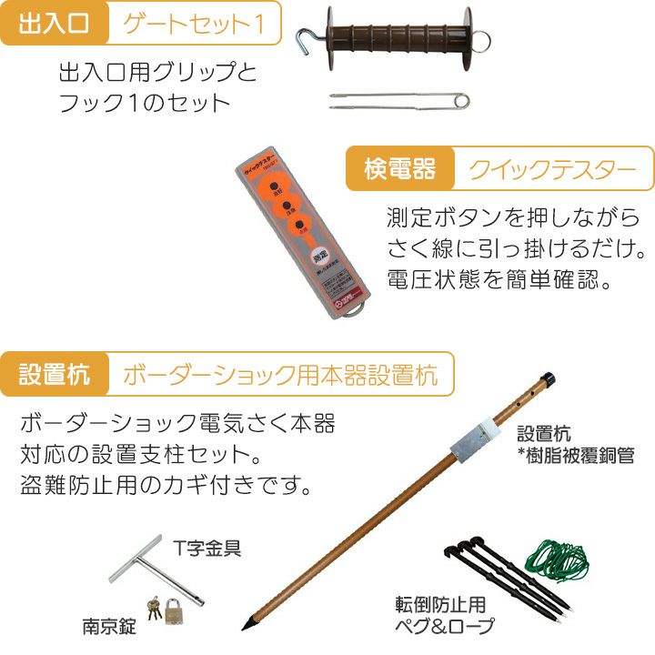 他の画像を見る タイガー 電気柵 電気さく 小動物向け タイガー 電気さくセットF 小動物対策 周囲600m さく線3段張仕様 出入口1カ所 電気柵 害獣 アライグマ ハクビシン 狸 セット商品 価格 ¥ 185,187 税込 詳細を見る お気に入りに登録する (0)