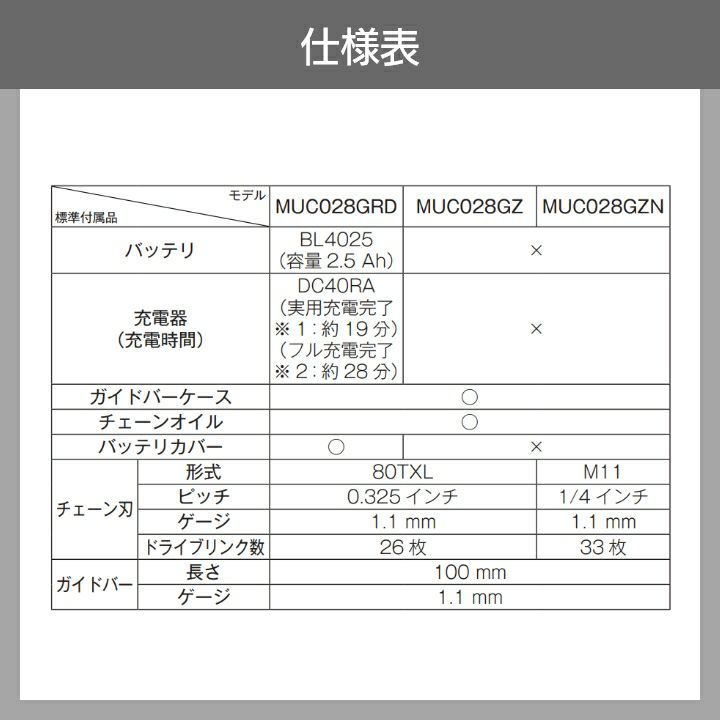 質量(kg):2.0(※チェーン刃、ガイドバー、バッテリBL4025含む)