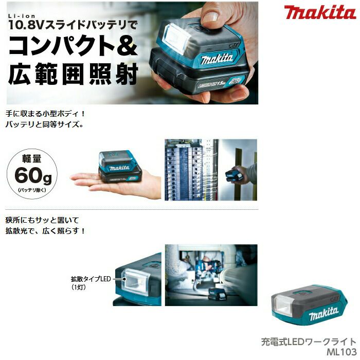 他の画像を見る マキタ ML103 マキタ 10.8V マキタ / makita 充電式LEDワークライト ML103 バッテリ・充電器別売 非常灯 ライト LED 充電式 価格 ¥ 4,180 税込 詳細を見る お気に入りに登録する (0)