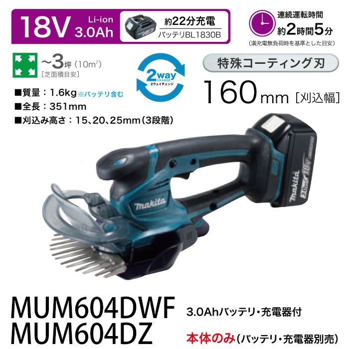 芝生バリカン マキタ 芝刈りバリカン 芝生バリカン 18V マキタ 充電式 芝生バリカン 18V MUM604DZ 刈込み幅 160mm トリマ 1.6kg 本体のみ バッテリ充電器別売 特殊コーティング刃 やにがつきにくくサビにくい