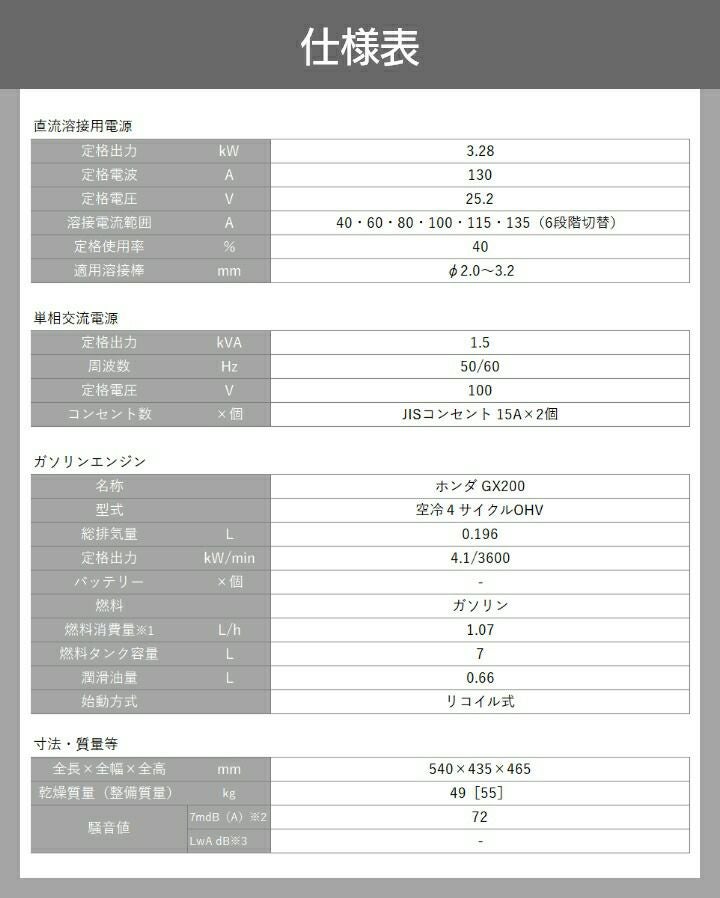 他の画像を見る 営業所止 設置場所要確認 デンヨー 発電機 インバーター 災害 防災 キャンプ デンヨー 溶接機 GAW-135 インバーター発電機 ウェルダー 1500W 1.5kVA インバータ発電機 ガソリンエンジン 価格 ¥ 272,800 税込 在庫切れ 詳細を見る お気に入りに登録する