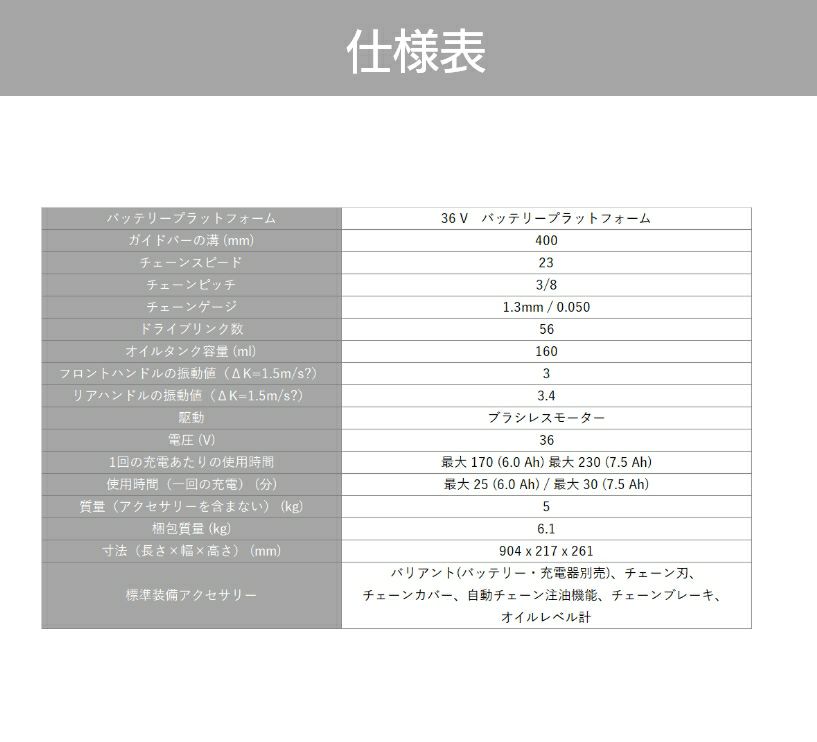 他の画像を見る ガイドバー400mm チェンスピード23m/s チェンピッチ3/8"LP チェンゲージ1.3mm / 0.050" ドライブリンク数 56コマ リヤハンドル チェーンソー チェンソー ケルヒャー 充電式 バッテリー 36V CS 400/36 BP リアハンドル 5kg 自動チェーン注油機能 本体のみ(充電器バッテリー別売) 1.042-504.0 価格 ¥ 71,137 税込 詳細を見る お気に入りに登録する